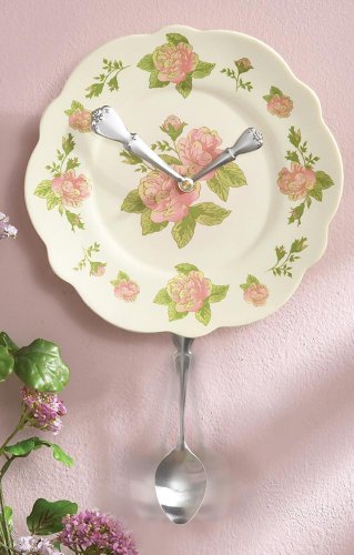 Pretty rose-petal resin dinner plate creates the face of this unique clock and the bloom-pattern border become the numbers. Silver-finish spoon pendulum adds he finishing touch. Req. 1 AA battery (not incl.). 15"H x 9"Dia....